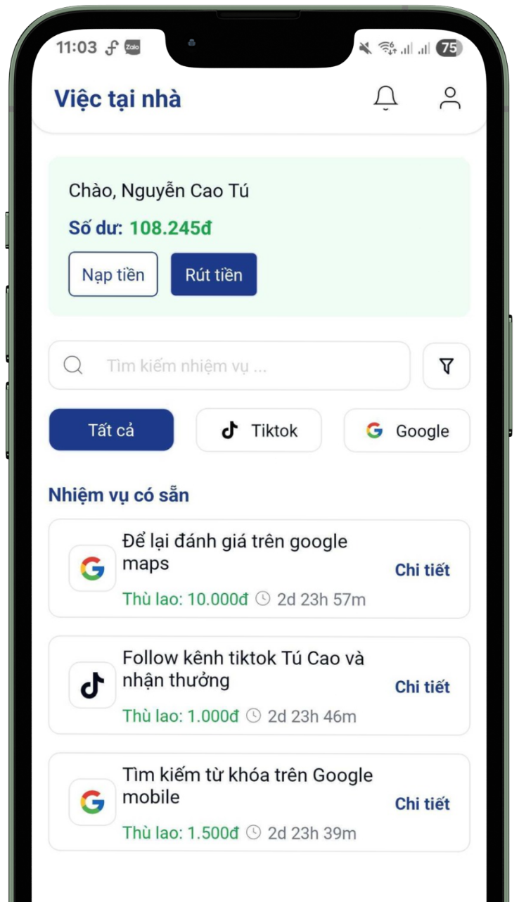 Nhận thông báo nhiệm vụ mới và hoàn thành ngay lập tức để tối đa hóa thu nhập, mỗi nhiệm vụ chỉ diễn ra trong vài phút.